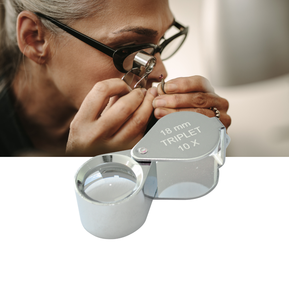 - Aumento de 10X: La lupa Triplet tiene un aumento de 10X, lo que permite examinar con detalle pequeñas piezas, como joyas, relojes y piedras preciosas.