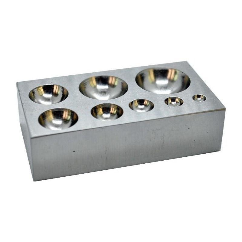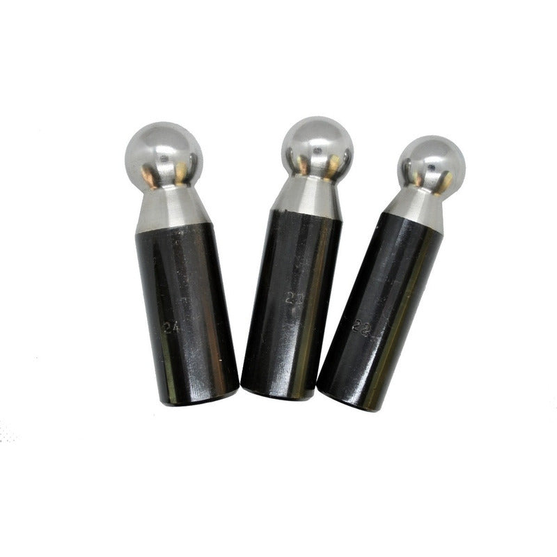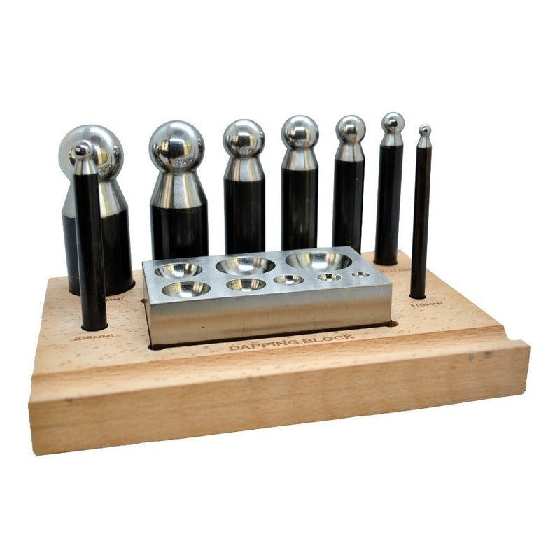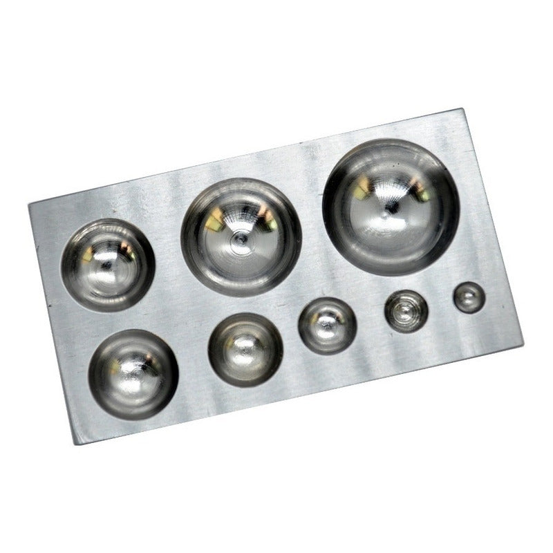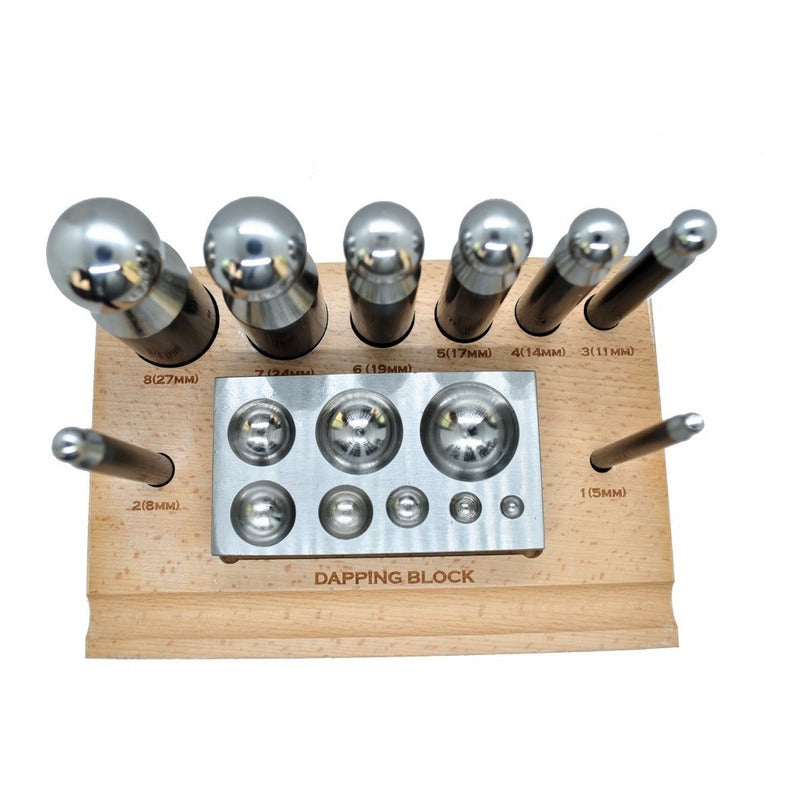 Juego de 8 Embutidores y Dado con Base de Madera Juego de 8 embutidores de acero templado pulido de 5 a 27 mm con dado de acero con semiesferas de diferente tamaño y base de madera, Embutidores, diámetros de 5mm, 8mm, 11mm, 14mm, 17mm, 19mm, 24mm y 27mm. Marca: Kap Tools
