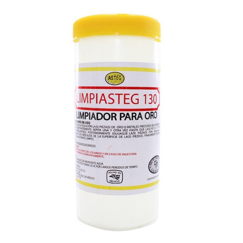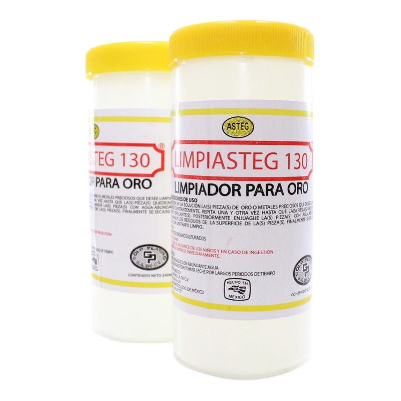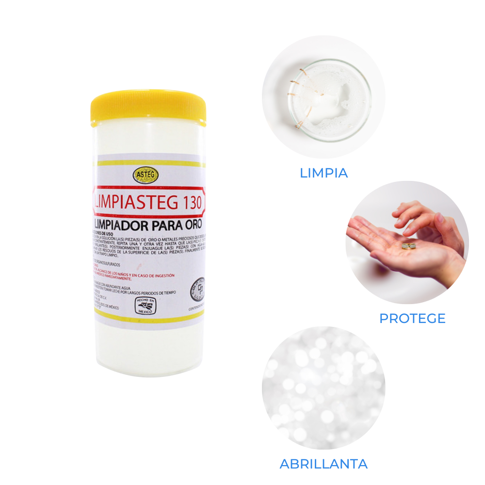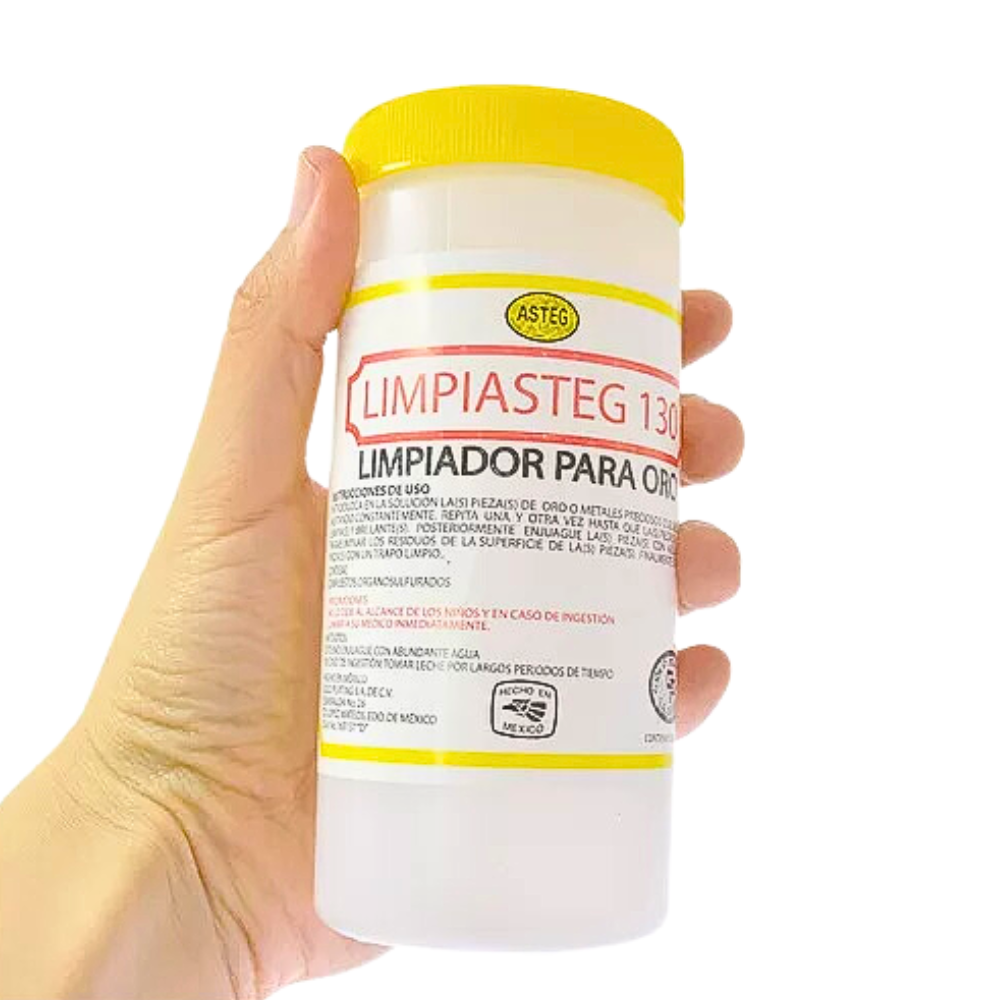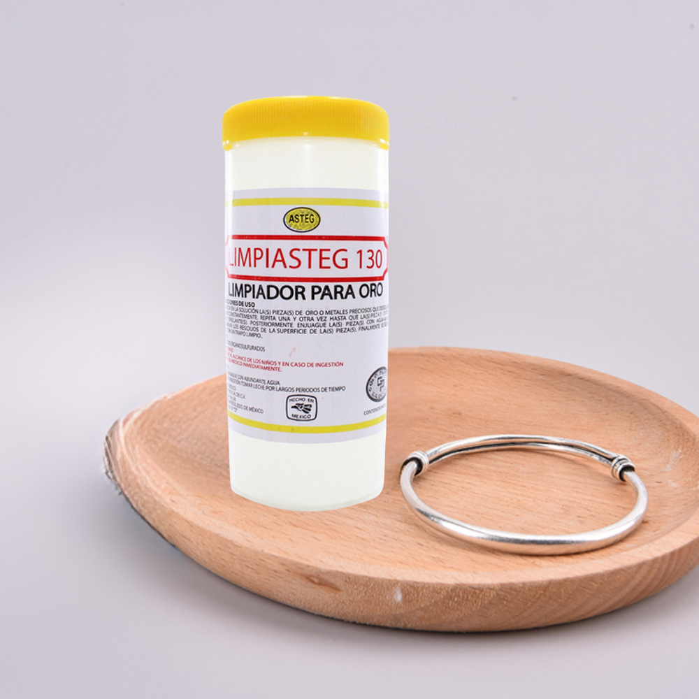 Limpiasteg 130 Para Oro 240 ML. Solución instantánea para Limpiar Oro. Muy recomendable para una limpieza profunda de toda su joyería. Como cadenas, pulseras, aretes, collares, etc. Además es fácil de usar. Solo basta sumergir en el líquido Asteg Limpiasteg-130 unos segundos. Enjuagar en agua purificada y secar con franela y listo.