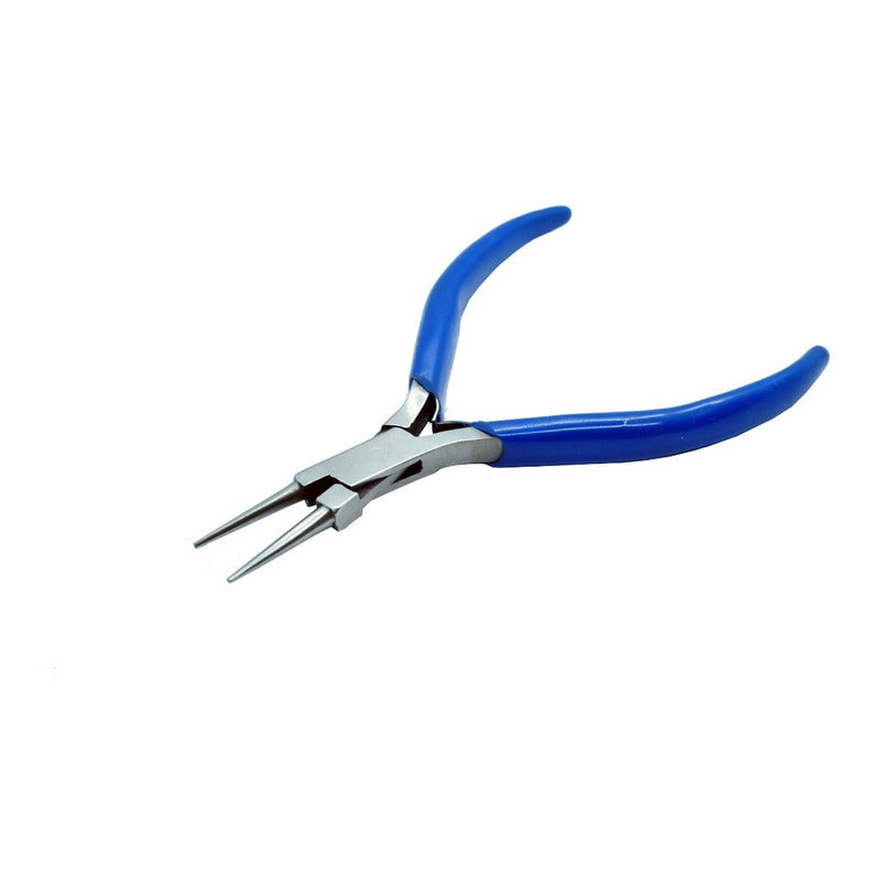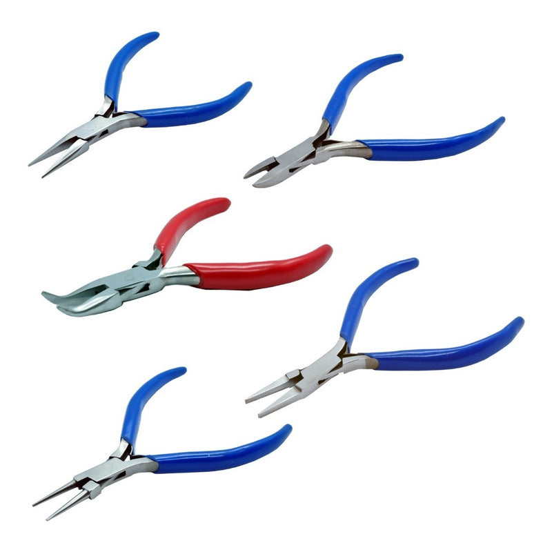 Juego de 5 pinzas para bisutería y joyería. Incluye: Pinza de Punta Media Caña 115mm Pinza de Corte Lateral 115mm Pinza de Punta Redonda 115mm Pinza de Punta Plana 115mm Pinza de Punta Curva 130mm